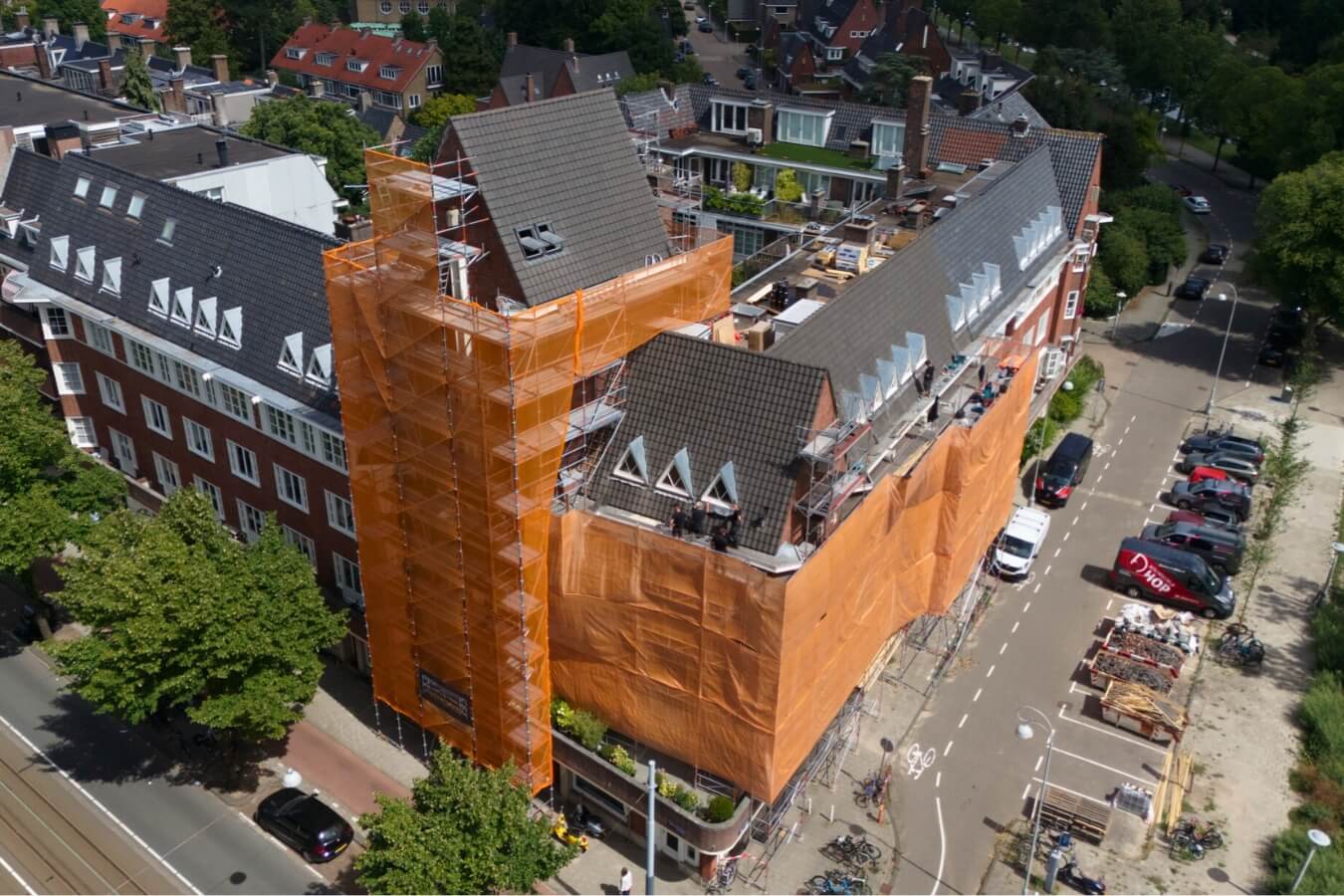 De personenlift wordt geïntegreerd in de steiger opstelling en afgestemd op de situatie ter plaatse. Hierdoor vormt de lift één geheel met de steiger en blijft de werkomgeving duidelijk en logisch ingericht. Vooral bij werkzaamheden die zich over meerdere verdiepingen uitstrekken, biedt dit een praktische oplossing. Het gebruik van een personenlift maakt werken op hoogte beter beheersbaar en draagt bij aan een georganiseerde en veilige werkomgeving voor iedereen op de bouwplaats.